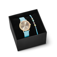 Le set est soigneusement emballé dans une boîte cadeau et se compose de la montre Ronde Pastel Lovers Gold Bracelet en cuir bleu et du collier Joyful Colours Turquoise-Multi Color.